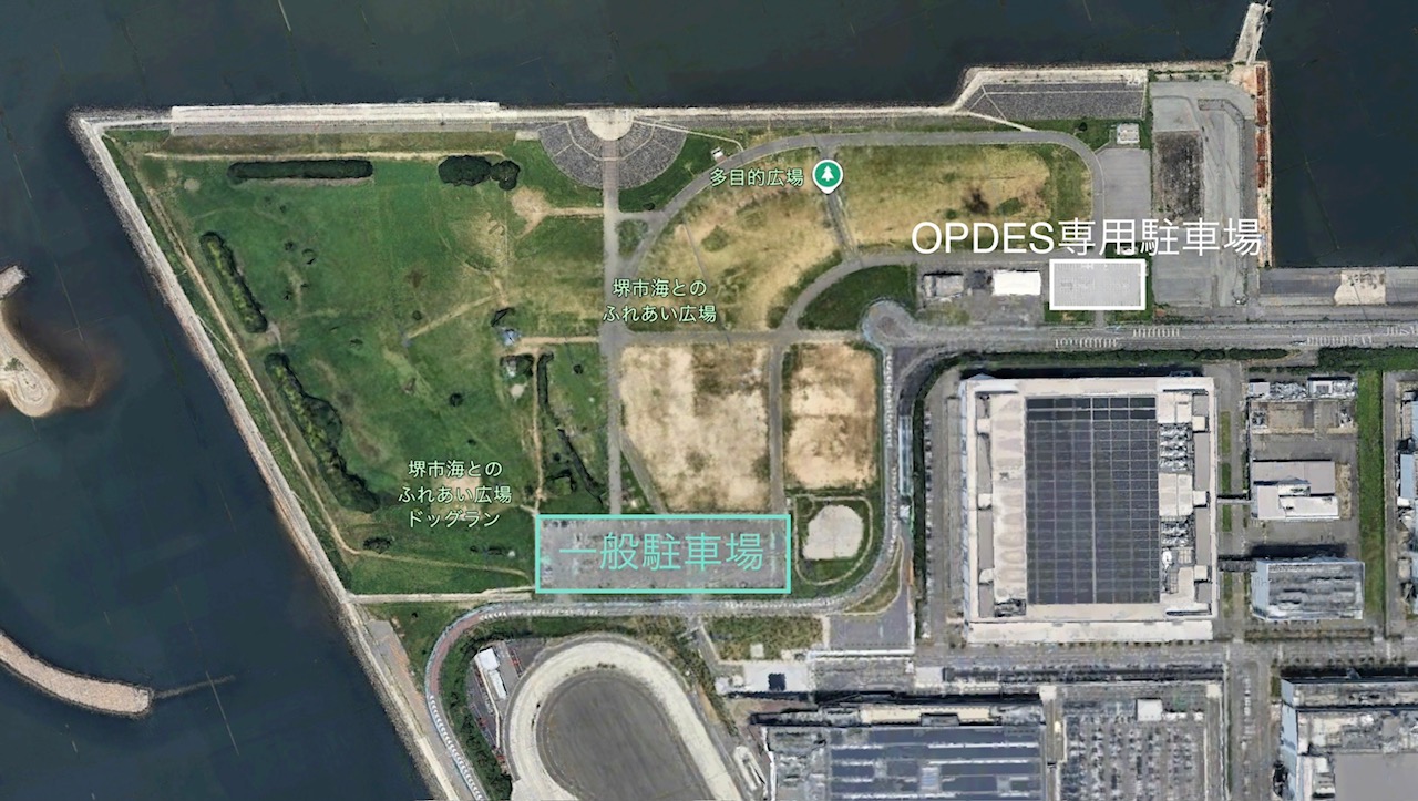 お車でお越しの方は、海とのふれあい広場第1駐車場(一般駐車場)ではなく、第2駐車場(OPDESアジリティ専用駐車)をご利用ください。